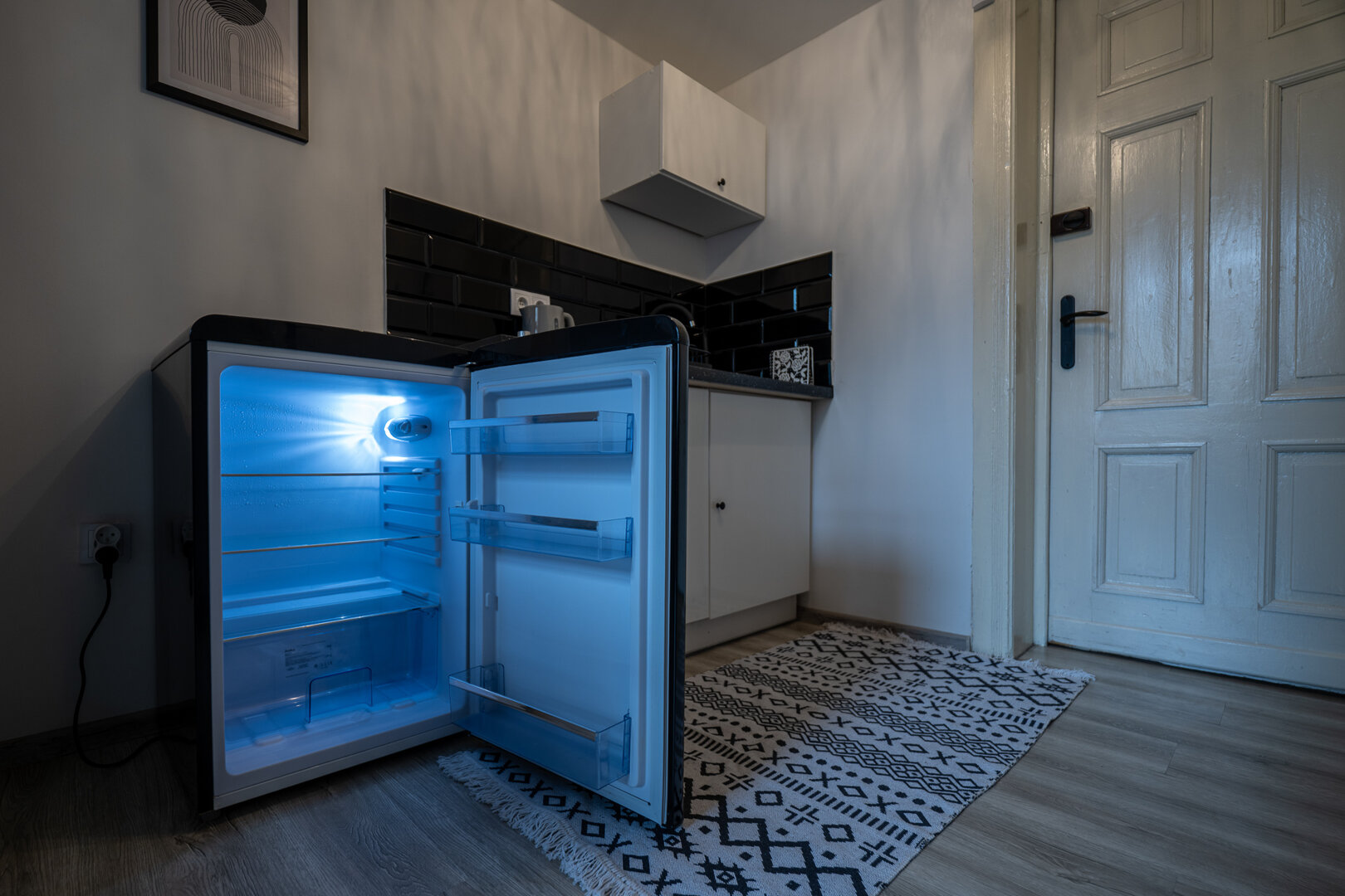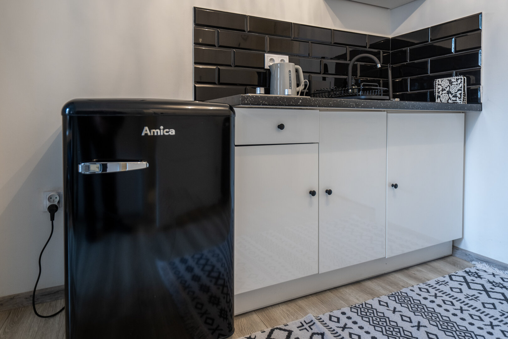 Jasne studio inspirowane latem: turkusowa lodówka, kolorowe płytki i lekkie tkaniny tworzą wakacyjny klimat w centrum miasta. Wygodne łóżko małżeńskie i rozkładana sofa pomieszczą do 4 osób. Aneks kuchenny, szybkie Wi-Fi oraz Smart TV z Netflixem sprzyjaj