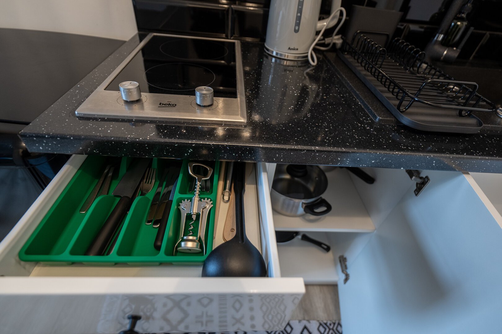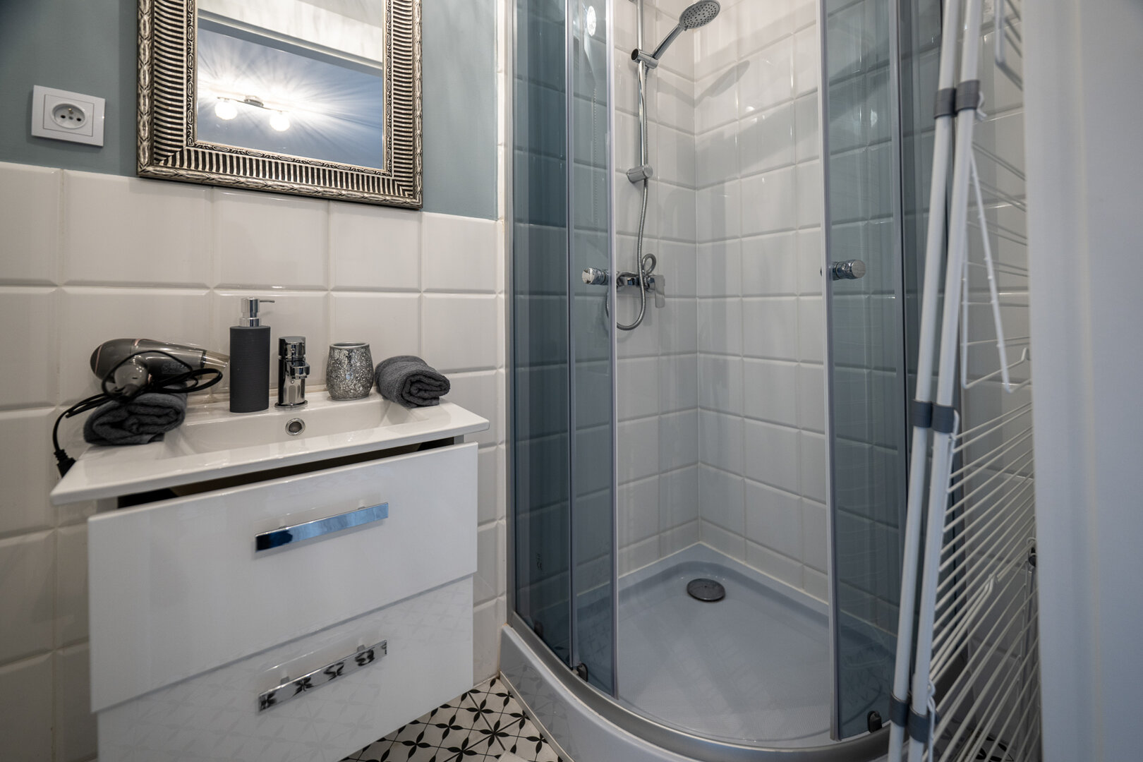 Nowoczesny loft inspirowany zimą – chłodne szarości, granatowa sofa i biało-czarne akcenty tworzą klimat zimowego city breaku. Na antresoli wygodne podówjne łóżko, na dole rozkładana sofa, stół do pracy lub posiłków oraz w pełni wyposażony aneks kuchenny. Stylowa łazienka z prysznicem, szybkie Wi-Fi i Smart TV z Netflixem sprawiają, że to idealne miejsce na wieczorny chill po dniu w mieście.