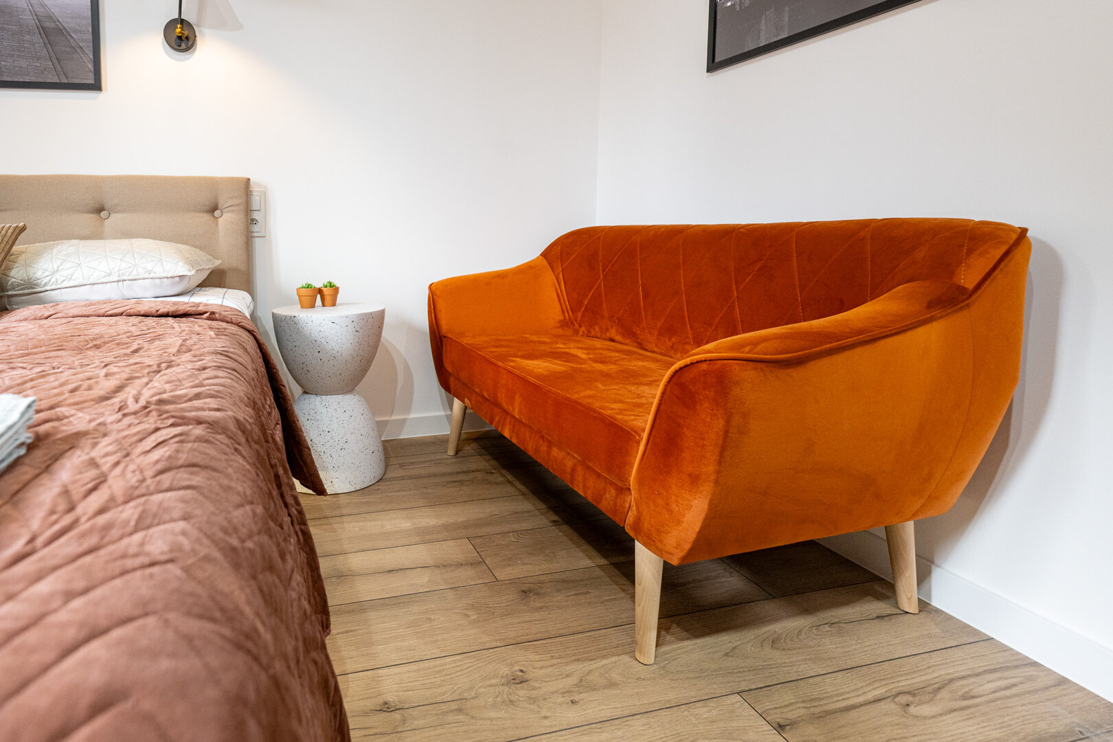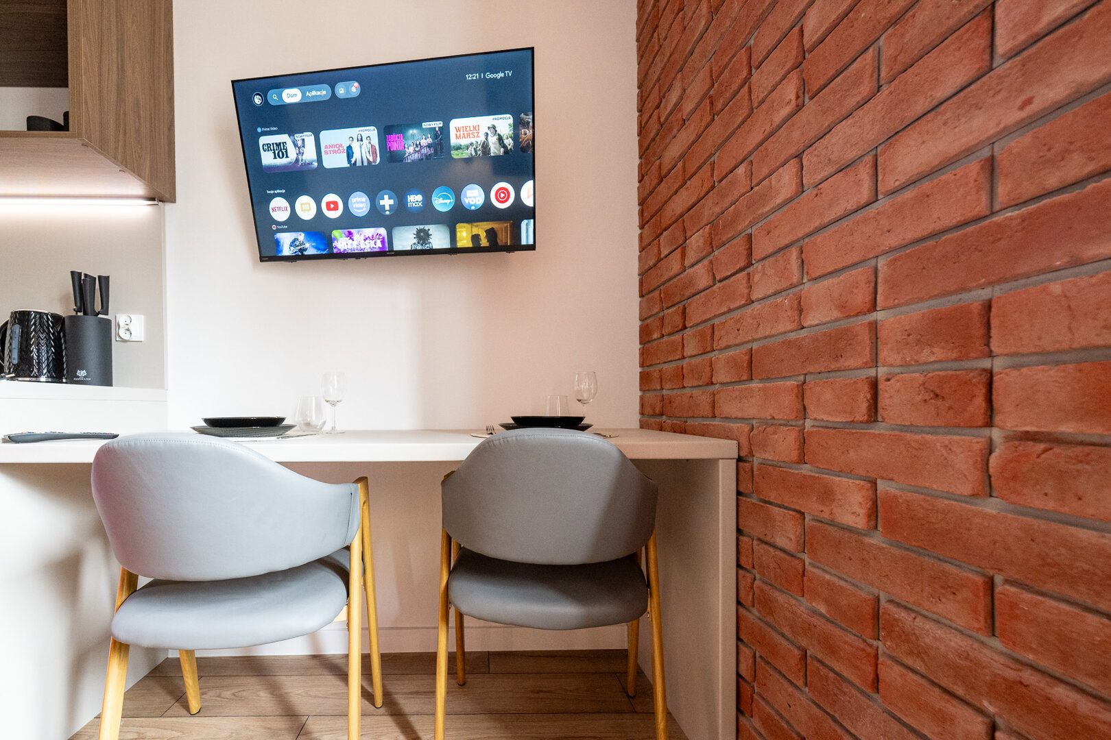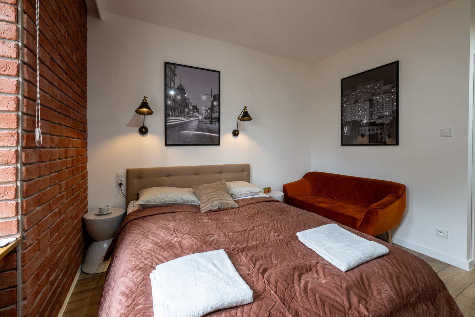 To miejsce ma w sobie coś więcej niż wygodę — ma nastrój. Butikowy loft przy Targowej 75 łączy cegłę, miękkie tkaniny, ciepłe światło i dopracowane detale w przestrzeń, która działa na wyobraźnię. Wieczorem LED-y wydobywają charakter wnętrza, łóżko zyskuje nastrojową oprawę, a całość zamienia się w idealne miejsce na spokojny wieczór we dwoje, odpoczynek po mieście i chwilę tylko dla siebie.