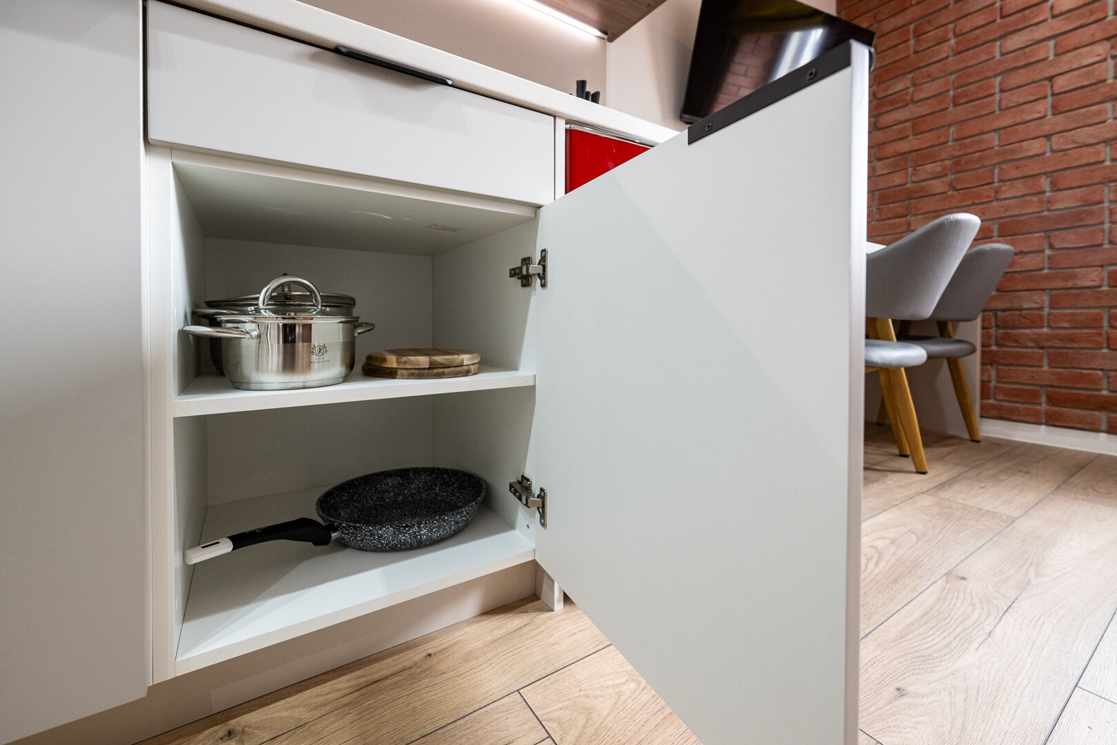 Przytulny loft o jesiennym klimacie – ceglane ściany, czerwona welurowa sofa i ciepłe drewno tworzą atmosferę wieczornego chilloutu. Komfortowe miejsce do spania dla dwóch osób, w pełni wyposażony aneks kuchenny oraz nowoczesna łazienka z prysznicem typu